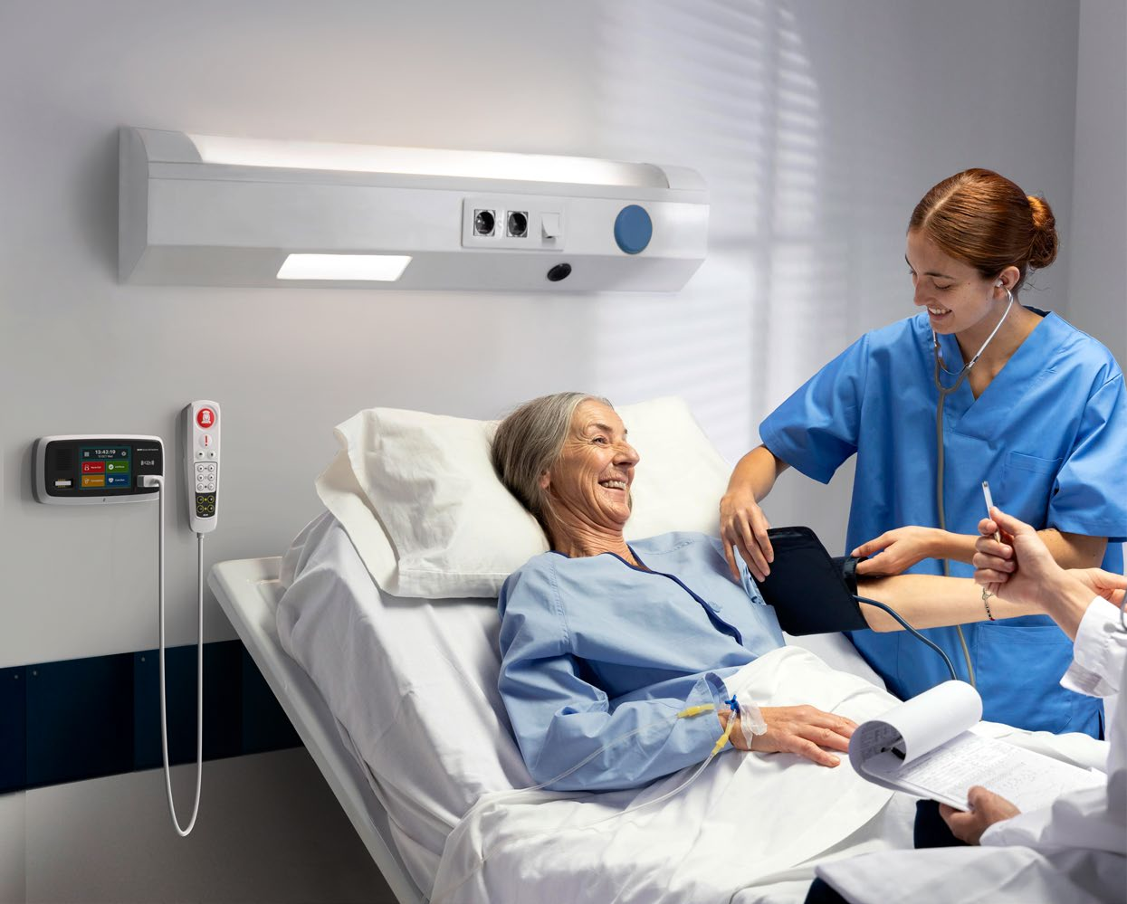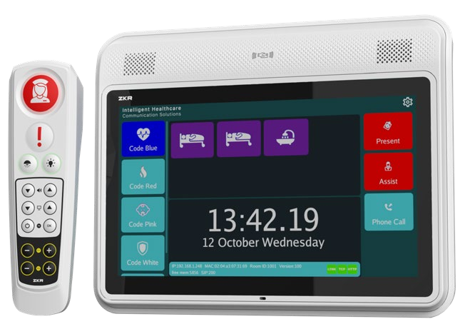 The system is designed to provide high level of communication between patients and nurses. It is also possible to integrate functions such as a room lightning, TV control, window blinds, and temperature from the handset as well as voice communication through Comfort series products between patient and nurse, or even external phone calls. Voice recordings of conversations between patient and staff or staff and other staff may be stored in the system for review by the hospital to improve quality of service. External phone calls can be tracked and billed to patients.